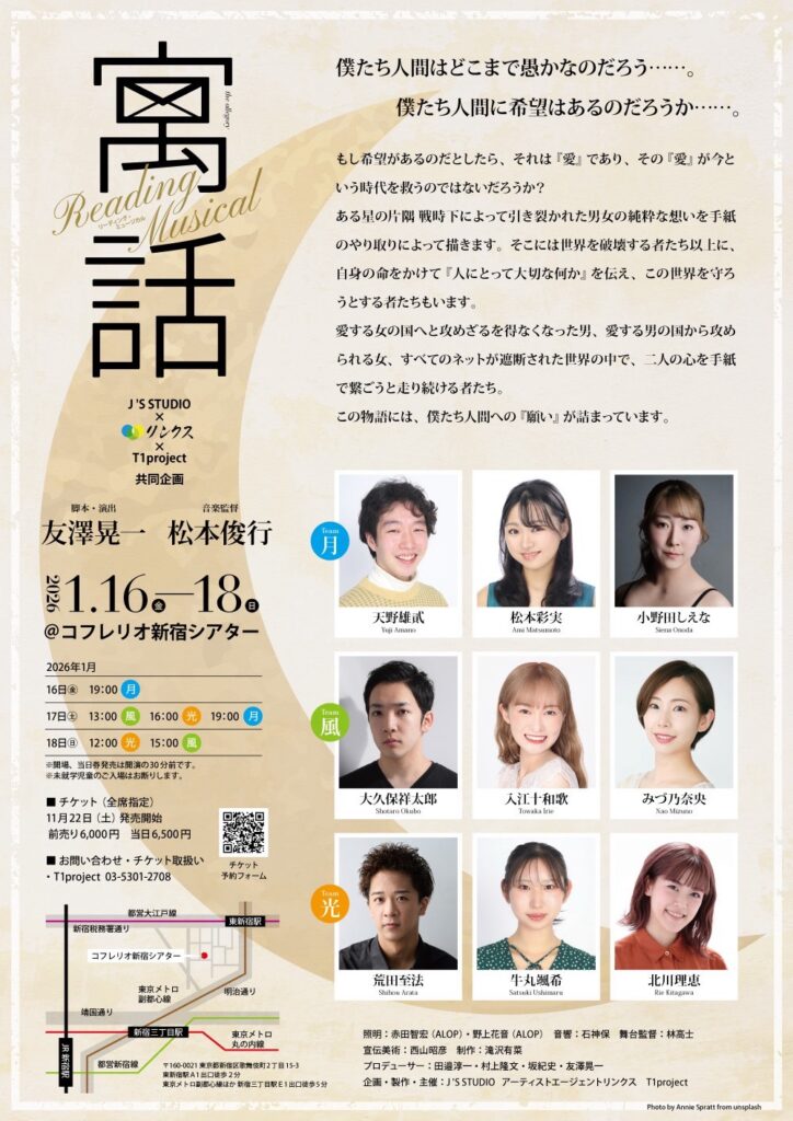 リーディングミュージカル「寓話」風チームにて出演予定でした野村拓海さんですが、諸事情により本公演を降板することになりました。野村さんの代役として大久保祥太郎さんが出演することになりました。